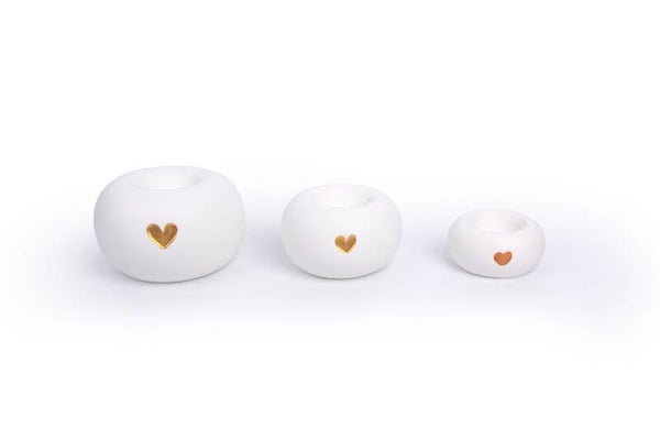 Ronde witte urn voor waxinelichtje met klein gouden hartje mt M
